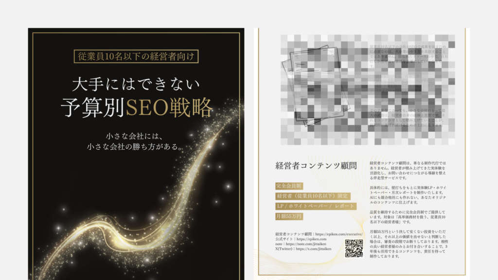 具体的には、壁打ちをもとに実体験LP・ホワイトペーパー・月次レポートを制作いたします。AIにも競合他社にも作れない、あなたオリジナルのコンテンツに仕上げます。